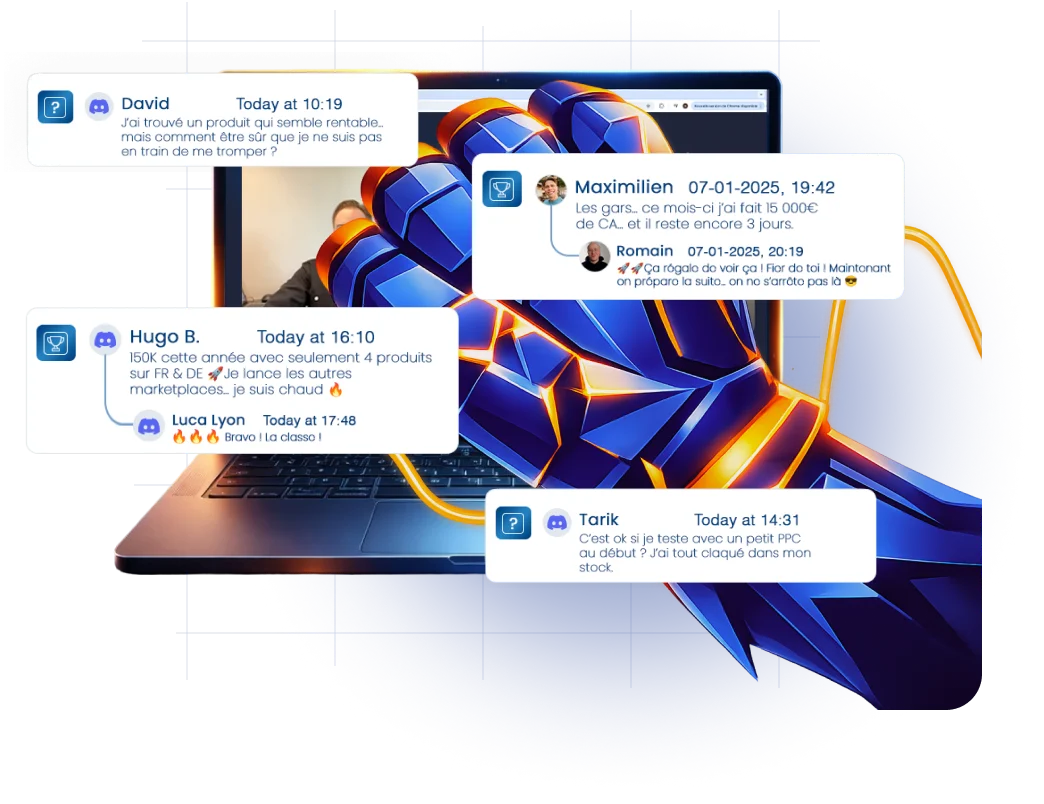 Tu bénéficies de réductions exclusives sur des outils indispensables pour ton business Amazon. Ces partenariats te permettent d’économiser plus de 1 000 €, tout en utilisant les meilleurs logiciels du marché. Résultat : tu démarres mieux équipé, avec un budget optimisé.